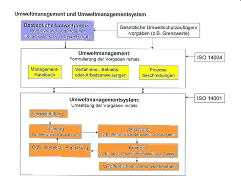 Das Umweltmanagement setzt mit Hilfe des Umweltmanagementsystems die Vorgaben der Leitung einer Organisation (und damit auch die behördlichen/gesetzlichen Anforderungen) hinsichtlich des Umweltschutzes um. Hierzu werden entsprechende Anforderungen (Vorgaben) im Managementhandbuch, in diversen Anweisungen und/oder in Prozessbeschreibungen festgelegt, deren Umsetzung und Überwachung dann durch das Umweltmanagementsystem erfolgt.