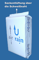 FFS-Sack für alle Pulver wie z. B. Zement mit dem speziell eingebrachten Entlüftungskanal entlang der Längsnaht. Über diesen Kanal wird frei werdende Luft im Sack permanent abgeführt. Die Kopf- und Bodennaht sind durch die FFS-Abfüllanlage abgeschweißt worden. Bei anliegenden Überdruck im Sackinneren, öffnet sich nur die Schweißnaht des Entlüftungskanals gezielt um den Innendruck des Sackes dem Atmosphärendruck anzugleichen. Dadurch ist sichergestellt, dass der gefüllte Sack gut stapelbar und sicher transportierbar ist. Die Entlüftung geschieht permanent auch im gestapeltem Zustand, so dass die Säcke flächig aufeinander liegen und nicht verrutschen. Eine Außenlagerung ist ohne weiteren Schutz möglich. |